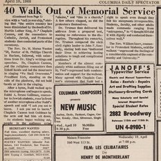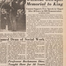 The well-attended memorial proceeded as planned until midway through some remarks by Provost Truman, when Mark Rudd, the chairman of Columbia’s SDS branch, left his seat in the nave and proceeded to the pulpit. Unchecked by Chaplain Cannon, Rudd commandeered the microphone and declared the service an "obscenity" considering Columbia's mistreatment of blacks and workers on campus, for whom King gave his life. Rudd then descended from the pulpit walked down the main aisle, followed by about forty other attendees, and left the chapel. Chaplain Cannon's tacit condoning of Rudd's right to speak his views angered President Kirk and Provost Truman, as well as some faculty in attendance, but made administrative disciplinary action out of the question.
