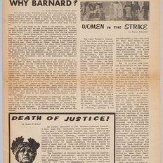 "Women in the Strike" by Nancy Biberman from 'At Issue', May 13, 1968. A Barnard student discusses women's experiences during the campus ocupation and subsequent strike. After the April 30 bust, during which police arrested 111 Barnard students, the women involved took several opportunities to reflect on their experiences as female strikers. Here Nancy Biberman’s writes in May 13th edition of 'At Issue'. Frustration with chauvinistic and inflexible male colleagues served as a consciousness-raising experience for many striking women. Women radicals, disheartened with the systematic sexism they saw in the New Left leadership, used experiences like the Columbia 1968 protests to lay the groundwork for the far-reaching women’s rights movement that would emerge in the 1970s.